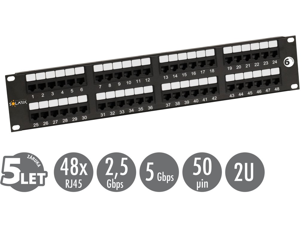 19" patch panel Solarix 48 x RJ45 CAT6 UTP 350 MHz černý 2U SX48-6-UTP-BK