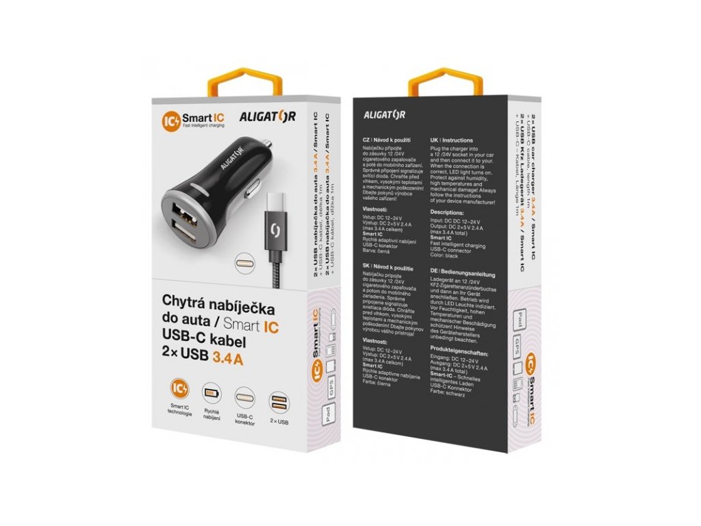 ALIGATOR Chytrá nabíječka do auta 3.4A, 2xUSB, smart IC, černá, USB-C kabel