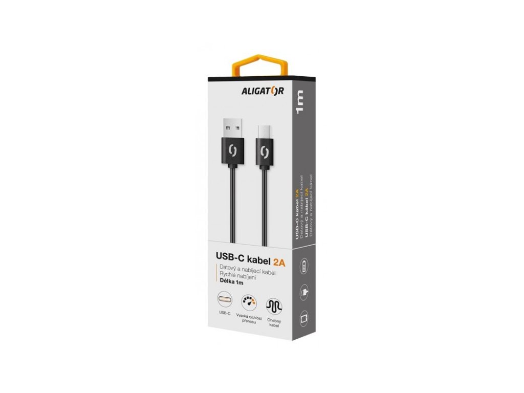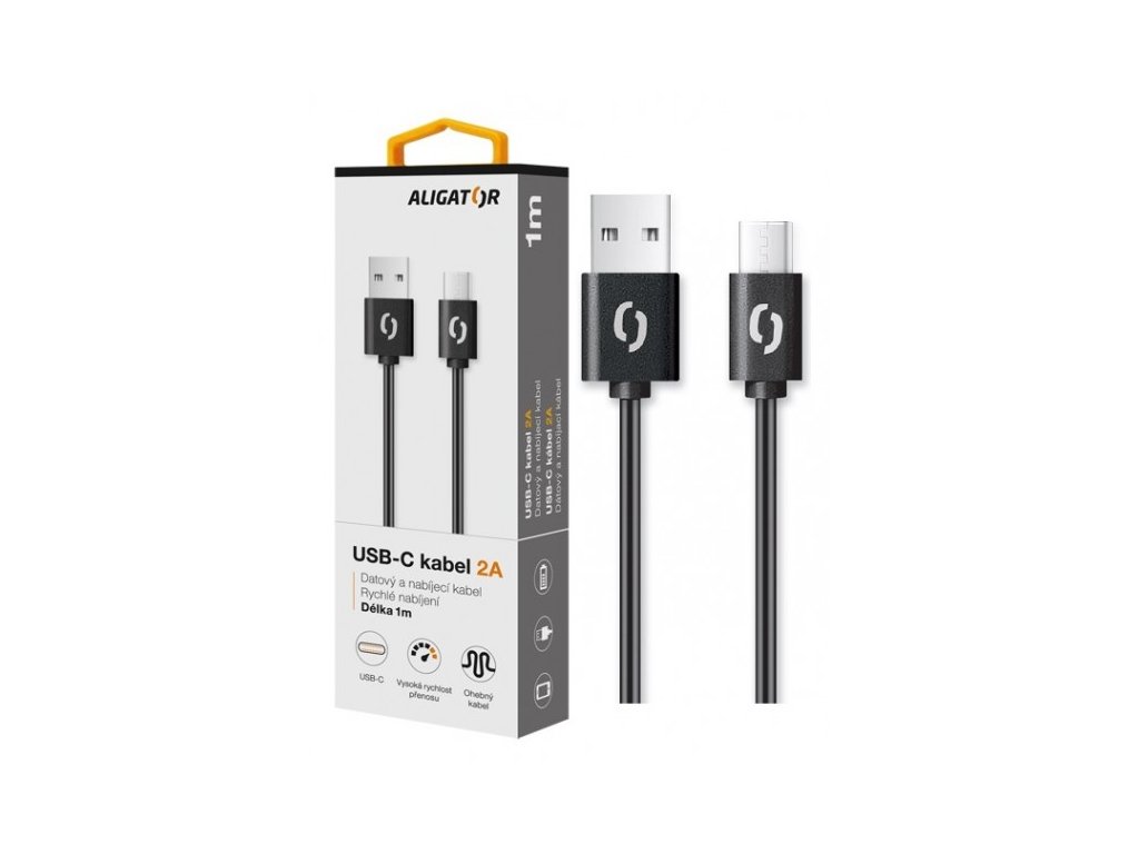 Datový a nabíjecí USB-C kabel ALIGATOR: *Vysoce kvalitní konektory *Vysoká rychlost přenosu dat *Možnost rychlého nabíjení 2A *Délka: 1m *Barva: černáDodatočné parametre