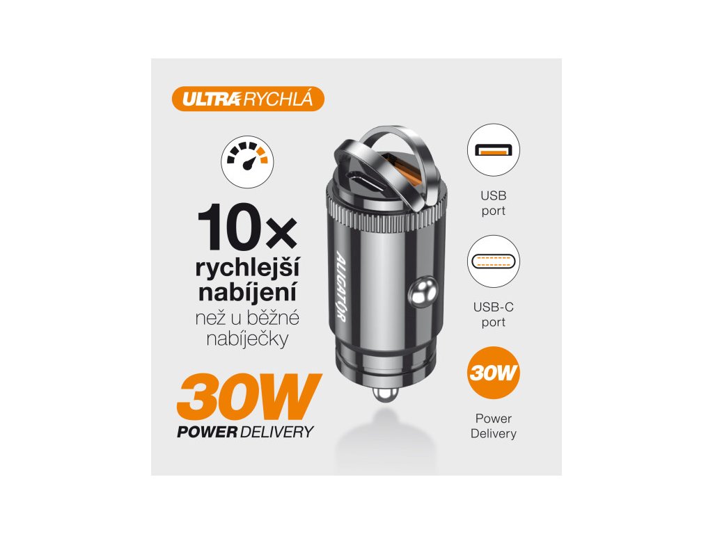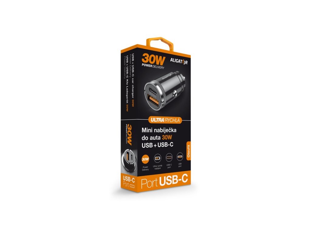 Výkonná a SMART Chytrá mini nabíječka do auta ALIGATOR Power Delivery 30W, USB-C + USB-A Výkonná miniaturní nabíječka do auta řady „POWER DELIVERY“ v elegantním kovovém provedení s USB-A portem a ultra rychlým USB-C portem o výkonu 30W. Miniaturní rozměry, velký výkon Díky kompaktnímu zpracování je nabíječka elegantním doplňkem a zároveň kvalitním pomocníkem při dobíjení Vašich zařízení. Miniaturní rozměry zajišťují, že nabíječka krásně zapadne do cigaretového zapalovače ve Vašem automobilu a za pomoci zvedacích úchytek jej můžete snadno vytáhnout. Tato nabíječka je ideální pro dobíjení mobilních telefonů, tabletů a jiných zařízení. Chytrá nabíječka zvládne doplnit energii až dvěma přístrojům najednou, navíc je vybavena ultra rychlým USB-C portem s výkonem až 30W. Až 10x rychlejší oproti běžné USB nabíječce Power Delivery je technologie rychlého nabíjení, která uživateli poskytuje vyšší výkon a zkracuje dobu nabíjení pomocí konektoru USB-C. Technické parametry: • Vstup: DC 12-24V • Výstup: USB-C + USB-A: DC 5V – 3A • Power Delivery 30W • Ochrana proti zkratu a přetíženíDodatočné parametre