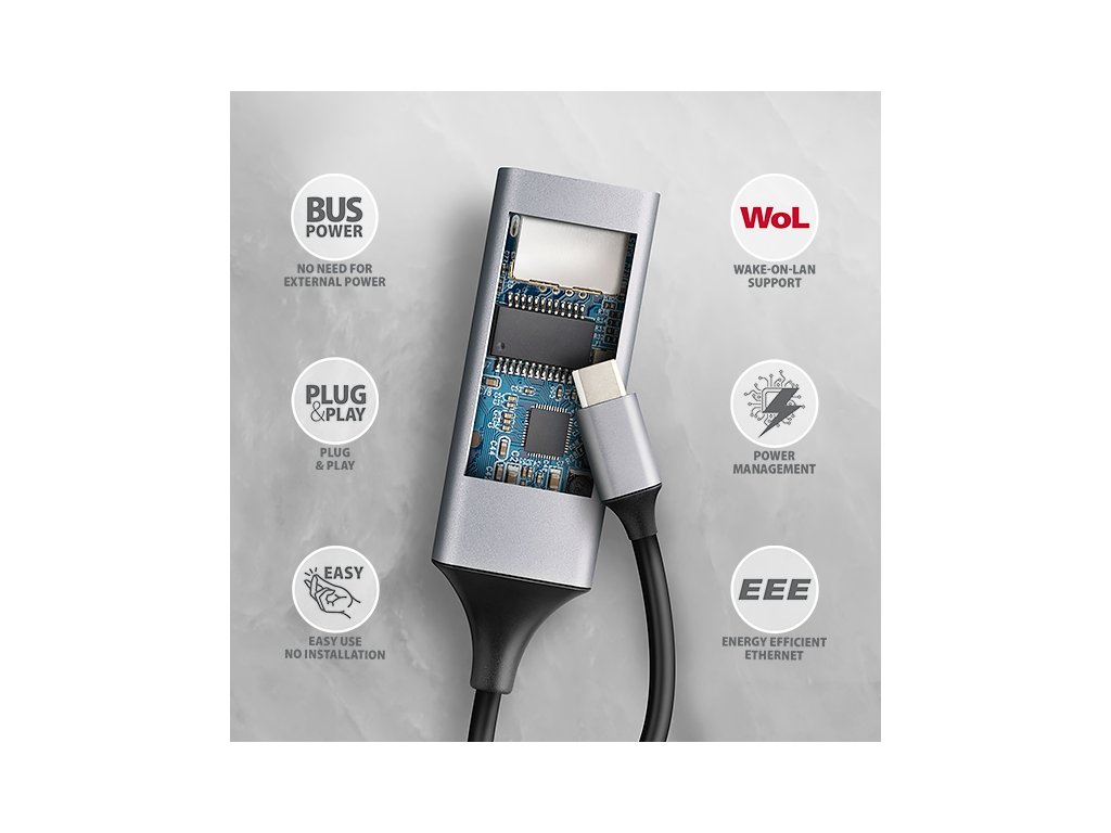 Externí síťová karta AXAGON ADE-TXPD s konektorem USB-C PD 100W snadno přemění USB-C port na Gigabit Ethernet port. Adaptér může doplnit chybějící síťový RJ-45 konektor, přidat další síťovou kartu nebo nahradit původní nefunkční síťové připojení. Velkou výhodu představuje integrovaný konektor Power Delivery, který umožňuje připojení nabíječky a tím poskytuje možnost napájení notebooku. Díky 15 cm kabelu s USB-C koncovkou můžete připojit Ethernet adaptér k jakémukoliv počítači, tabletu nebo telefonu. Tato USB síťovka je kompatibilní s rychlostmi 10/100/1000 Mbit/s a rozšíří počítač o rychlé a stabilní síťové připojení. LAN adaptér nabízí kromě gigabitové propustnosti širokou škálu funkcí např. IPv4/IPv6 checksum pro snížení zátěže CPU kontrolními součty, crossover detekci a autokorekci, TCP large send offload, podporu různých módů Wake-on-LAN funkce, práce s VLAN nebo pokročilé funkce Power Managementu. PD USB-C vstup je určen pro vhodnou Power Delivery nabíječku. Díky tomu je vaše mobilní zařízení napájeno přímo z PD nabíječky s využitím technologie Power Delivery 3.0 s výkonem až 100 W. Kovový obal adaptéru je vyrobený z hliníku a zajišťuje tak dokonalou mechanickou ochranu a výborný odvod tepla. Díky kompaktním rozměrům a minimální hmotnosti je to ideální doplněk pro přenosné počítače a další mobilní zařízení. Podpora současných verzí operačních systémů Windows, macOS, Linux nebo Chrome OS umožňuje použití adaptéru pro jakýkoliv stolní počítač, notebook nebo ultrabook vybavený moderním oboustranným USB-C konektorem. Ve Windows od verze 8.1 výše umožňuje adaptér snadnou automatickou instalaci bez nutnosti připojení k internetu. Ethernet adaptér využijí také uživatelé tabletů nebo mobilních telefonů se systémem iPad OS, iOS nebo Android podporujících možnost kabelového Ethernet připojení. Navíc je adaptér díky použitému čipu podporován i operačním systémem herních konzolí Nintendo Switch. Vstup (připojení k notebooku): • USB 5Gbps (USB 3.2 Gen 1 / USB 3.0), konektor USB-C male. • Kompatibilní s USB 3.2 Gen 2, USB4 a Thunderbolt 3/4. Vstup (napájení): • USB Power Delivery 3.0 - 100W port (jen napájení), konektor USB-C female. • Napájení mobilního zařízení z PD nabíječky přes USB-C síťovku. • Napájení PD musí podporovat jak mobilní zařízení, tak nabíječka. Výstup: • Rozhraní Gigabit Ethernet s RJ-45 konektorem pro připojení UTP nebo STP kabelem. • Podporované přenosové rychlosti Ethernet rozhraní 10/100/1000 Mb/s. • Podporované specifikace IEEE 802.3 10Base-T, IEEE 802.3u 100Base-TX, IEEE 802.3ab 1000Base-T. • 10/100/1000 Mb/s autodetekce. • Podpora IPv4/IPv6 packet Checksum Offload Engine (COE) pro snížení zatížení procesoru včetně IPv4 IP/TCP/UDP/ICMP/IGMP & IPv6 TCP/UDP/ICMPv6 kontroly a generování kontrolního součtu. • Podpora TCP Large Send Offload V1 a V2. • Podpora IEEE 802.1P Layer 2 priority encoding & decoding. • Podpora IEEE 802.1Q VLAN tagging. • Podpora IEEE 802.3az EEE (Energy Efficient Ethernet) - snížení spotřeby v klidovém stavu. • Podpora Jumbo frame. • Podpora Auto MDI/MDIX - crossover detekce a autokorekce eliminuje potřebu crossover kabelů. Další vlastnosti: • Plná podpora Plug and Play a Hot Plug. • Podpora CDC-ECM - pro automatickou instalaci ovladačů napříč různými OS. • Podpora CDC-NCM - pro nativní podporu bez instalace ovladačů v iOS/iPadOS/macOS/Linux. • Napájení po USB sběrnici (bus power) - není potřeba žádné přídavné napájení. • Dvě LED diody pro indikaci aktivity sítě a připojení adaptéru k síti. • Rozměry 76 x 24 x 16 mm. • Hmotnost 28 g (vč. kabelu). • Délka USB kabelu 15 cm. • Použit čipset ASIX AX88179A. Podpora funkce Wake-on-LAN v různých módech: • Podpora režimu spánku a vzdáleného probuzení přes Magic paket, Microsoft Wakeup Frame a Link Change wake-up. • Podpora Bonjour wake-on-demand. • Podpora Wakeup Packet Indication. • Podpora Microsoft Modern Standby. Pokročilé funkce Power Managementu: Adaptér podporuje pokročilou správu napájení redukující ztráty při klidovém stavu nebo lehkém provozu na síti. Dále podporuje pokročilou úsporu energie při odpojení Ethernet kabelu. • Podpora Power Management offload (ARP & NS). • Podpora standardu ECMA-393 proxZzzy® for sleeping hosts pro správu síťového připojení spících hostů pomocí proxy serverů. Podporované operační systémy: • Windows, macOS, iPad OS, iOS, Linux, Chrome OS, Nintendo Switch system software a Android (POZOR – nutno ověřit u výrobce Android zařízení, zda je podporována možnost Ethernet připojení). Balení v kartonové krabičce s otvorem pro zavěšení obsahuje: • USB - Gigabit Ethernet adaptér s USB-C kabelem 15 cm napevno, • vícejazyčný návod CZ/DE/DK/ENG/ESP/FIN/FR/GR/HR/HU/IT/NL/PL/PT/RO/SK/SWE/TR/UA/BG/CN/ARA, • baleno v kartonové krabičce s otvorem pro zavěšení.Dodatočné parametre