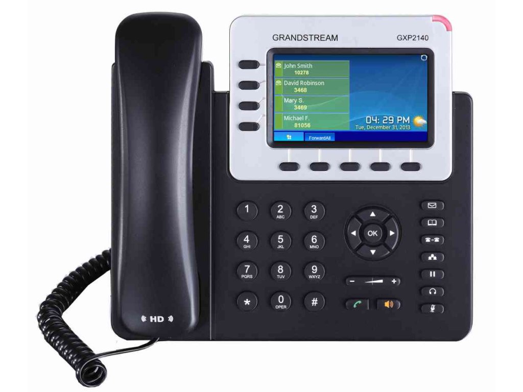 Reprezentativní přitom výkonný podnikový IP telefon: GXP2140 Téměř každá společnost či instituce, která disponuje velkým rozsahem telefonních čísel, se dnes neobejde bez přístroje, z kterého lze jejich provoz snadno, rychle a efektivně řídit. Velkým pomocníkem je určitě telefonní ústředna, která umí podstatnou část ať už příchozích, nebo odchozích hovorů, sama směrovat a automaticky řídit. Pořád se ale setkáváme se situacemi, kdy je vyžadována práce lidského faktoru, který je prostě stále v některých ohledech nepostradatelný. V takovém případě jistě oceníte kvalitního pomocníka, jakým model GXP2140 bezesporu je. Tento model najde nejčastěji využití na recepcích, vrátnicích, či jiných uvítacích halách, kde je kladen důraz na reprezentativní vzhled. Věříme, že GXP2140 svým moderním designem neurazí žádného uživatele. Právě naopak, a také že si ho navíc získá díky intuitivnímu menu, které se snadno ovládá na přehledném barevném 4.3“ TFT LCD displeji. Uživatelsky přívětivá je i možnost zvolení si vlastní vyzváněcí melodie. Při velkém rozsahu telefonních čísel se rovněž neobejdete bez adresáře. Telefon umí pracovat se vzdáleným centrálním telefonním seznamem, a to například ve formátech XML, nebo LDAP. V takovém případě je schopný pojmout až 2000 kontaktů a ukázat až 500 záznamů z historie volání. Export a import dat lze provést i pomocí USB slotu. V kombinaci s expanzním modulem GXP2200EXT získáte možnost využití BLF tlačítek s dvojbarevnou indikací stavu linek. Celkem můžete na jeden přístroj GXP2140 připojit až 4 moduly. Vzhledem k tomu, že jeden modul nabízí až 40 BLF tlačítek, dostanete se na maximální kapacitu úctyhodných 160 BLF tlačítek. Telefon samozřejmě podporuje i jiné funkce, na které jsou dnešní nároční uživatelé zvyklí. Patří mezi ně třeba Bluetooth, díky kterému lze využít komfortu bezdrátové náhlavní soupravy. Mezi ty techničtější pak patří duální 1Gb/s ethernetové porty, nebo funkce Qos, která upřednostňuje hlasové pakety před běžným datovým tokem, čímž zajišťuje vždy perfektní výsledek v rámci kvality zvuku hovoru. Všechny telefony Grandstream nabízí nejmodernější technologie šifrování zabezpečení (SRTP a TLS). Kombinace tohoto telefonu se zařízením IP PBX řady UCM společnosti Grandstream umožňuje využití funkce Zero-Config, která podporuje automatizované poskytování služeb pomocí konfiguračního souboru TR-069 nebo AES šifrovaného XML. Model lze konfigurovat se všemi dalšími významnými IP PBX systémy, například 3CX, Broadsoft, Asterisk...Dodatočné parametre