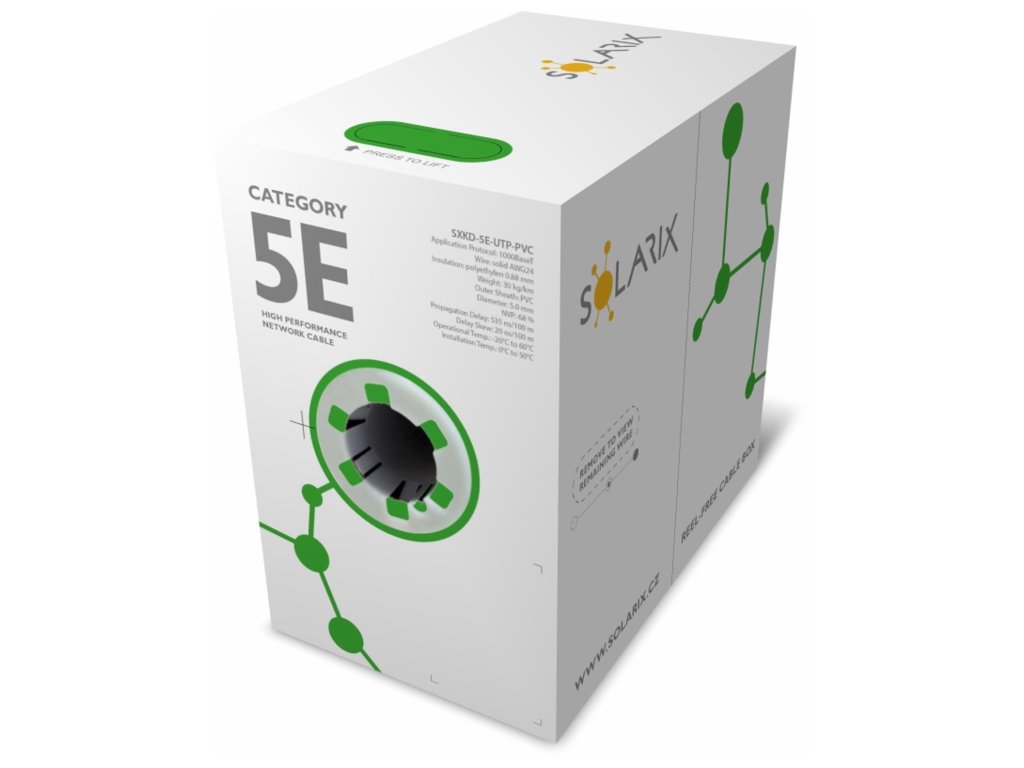 Instalační kabel Solarix s označením SXKD-5E-UTP-PVC je spolehlivý nestíněný kabel kategorie 5E, který je určený pro provoz ethernetových protokolů, včetně 2.5GBASE-T a 5GBASE-T*. Konstrukce kabelu je U/UTP, typ pláště PVC s třídou reakce na oheň Eca. Vodiče kabelu jsou vyrobeny z kvalitního měděného drátu s čistotou mědi 99,97 %. Kabel bez problémů splňuje požadavky z mezinárodních standardů ISO/IEC 11801, EN 50173 a ANSI/TIA 568.2-D. V případě CPR (nařízení EU č. 305/2011) je kabel testován u nezávislé laboratoře FORCE TECHNOLOGY v systému posuzování vlastností AVCP 3. Stejně jako ostatní kabely Solarix, je i kabel SXKD-5E-UTP-PVC značen metráží po 1 m v rozsahu od 0 do 305 m. Kabel je dodáván ve vysoce odolném třívrstvém leštěném kartónovém boxu (vždy barevně odlišeném podle typu kabelu), na kterém jsou uvedeny všechny nezbytné produktové informace, včetně čárových kódů, výrobní šarže, popisu a nejdůležitějších technických parametrů. Technické parametry Kategorie: CAT5E Podporované protokoly: 2.5/5GBASE-T a nižší Stínění: ne Šířka pásma: 100 MHz Typ a velikost vodiče: měděný drát 0,50 mm ± 0,005 mm Izolace a průměr vodiče s izolací: HDPE 0,88 mm Třída reakce na oheň; typ pláště: Eca; PVC Barva pláště: šedá RAL 7035 Průměr kabelu: 5,0 mm Váha: 29,2 kg/km NVP: 68 % Propagation delay: 535 ns/100 m Delay skew: nižší než 45 ns/100 m Skladovací teplota: -20 °C až 60 °C Provozní teplota: -20 °C až 60 °C Teplota při instalaci: 0 °C až 50 °C Balení: 305 m, třívrstvý kartónový box Rozměry balení (výška x hloubka x šířka): 350 mm x 350 mm x 205 mm Počet balení na paletě: 45 boxůDodatočné parametre