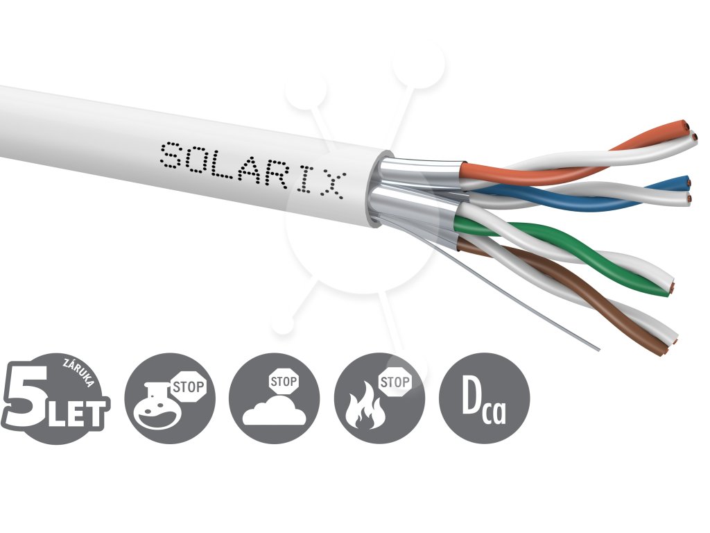 Instalační kabel Solarix s označením SXKD-6A-STP-LSOH je vysoce kvalitní stíněný kabel kategorie 6A, který je testován až do šířky pásma 650 MHz, a je určený pro provoz vysokorychlostních ethernetových protokolů, včetně 10GBASE-T. Konstrukce kabelu je U/FTP, typ pláště LSOH s třídou reakce na oheň Dca-s1,d2,a1. Vodiče kabelu jsou vyrobeny z kvalitního měděného drátu s čistotou mědi 99,97 %. Kabel bez problémů splňuje požadavky z mezinárodních standardů ISO/IEC 11801, EN 50173 a ANSI/TIA 568.2-D. Výkonové parametry tohoto kabelu byly otestovány nezávislou testovací zkušebnou FORCE TECHNOLOGY v rámci programu EC Verified, a to na nejvyšší úroveň tzv. Component Level. Certifikát je k dispozici zde na webu v záložce "Odkazy" nebo přímo na stránkách laboratoře FORCE. V případě CPR (nařízení EU č. 305/2011) je kabel testován v systému posuzování vlastností AVCP 3. Stejně jako ostatní kabely Solarix, je i kabel SXKD-6A-STP-LSOH značen metráží po 1 m v rozsahu od 0 do 500 m. Kabel je dodáván na vysoce pevné dřevěné cívce, na které jsou uvedeny všechny nezbytné produktové informace, včetně čárových kódů, výrobní šarže, popisu a nejdůležitějších technických parametrů. Technické parametry Kategorie: CAT6A Podporované protokoly: 10GBASE-T a nižší Stínění: fólie kolem každého páru Šířka pásma: testováno do 650 MHz Typ a velikost vodiče: měděný drát 0,56 mm ± 0,005 mm Izolace a průměr vodiče s izolací: skin-foam-skin PE 1,33 mm Třída reakce na oheň; typ pláště: Dca-s1,d2,a1; LSOH Barva pláště: šedá RAL 7035 Průměr kabelu: 7,4 mm Váha: 51,5 kg/km NVP: 75 % Propagation delay: 480 ns/100 m Delay skew: nižší než 45 ns/100 m Skladovací teplota: -20 °C až 60 °C Provozní teplota: -20 °C až 60 °C Teplota při instalaci: 0 °C až 50 °C Balení: 500 m, dřevěná cívka Rozměry balení (průměr x výška): 380 mm x 390 mm Počet balení na paletě: 27 cívekDodatočné parametre