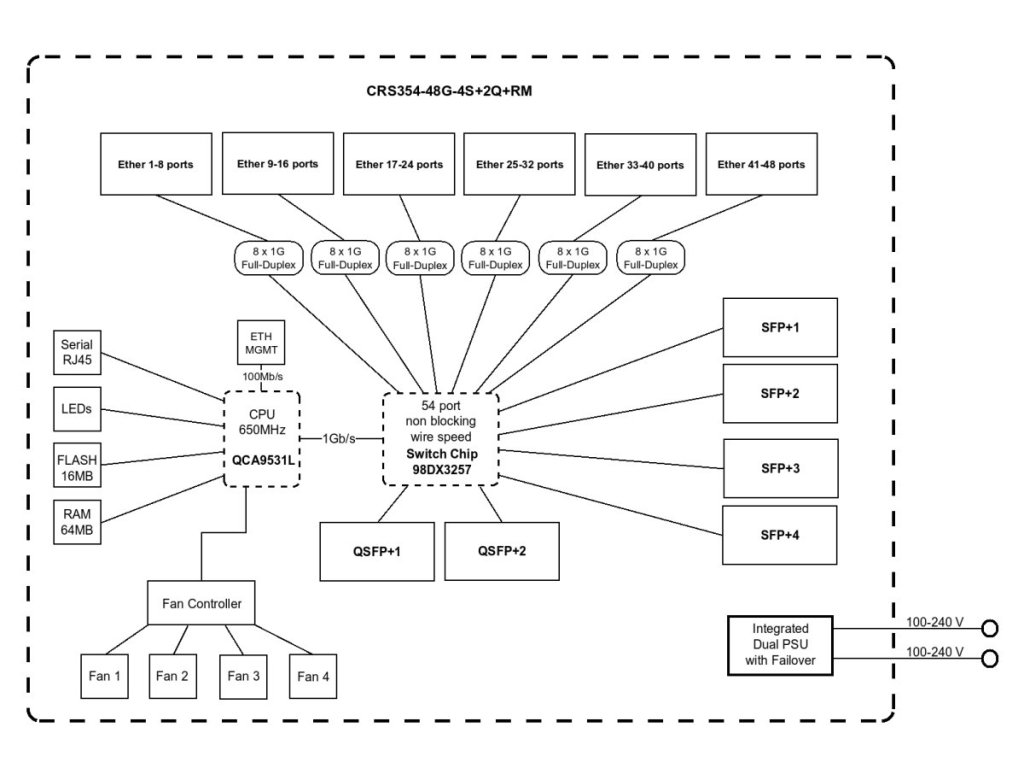 CRS354-48P-4S+2Q+RM je 54 portový switch osadený 48 Gbit ethernet PoE porty, ktoré ponúkajú široké možnosti výstupného POE napájania: pasívne POE, nízkonapäťové POE, 802.3af / at (Type 1 POE, Type 2 POE +) s automatickým rozpoznaním. 4 SFP + porty ponúka rýchlosť až 10Gbps cez optické vlákna alebo ethernet + 2x 40G QSFP+ porty. Switch je zabudovaný do 1U rackmount skrine s integrovaným 100-240VAC zdrojom, ktorý poskytuje výkon 700W. Samotné zariadenie má maximálnu spotrebu 44W a až 450W tak zostáva na napájanie pripojených POE zariadení (3x150W pre každú skupinu 8 portov).