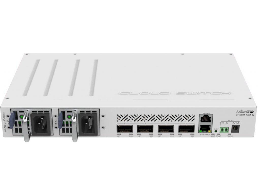 Optický Cloud Router Switch CRS504-4XQ-IN je vhodné 19" rackmount riešenie pre vstup do 100 Gbps sietí a ako malý centrálny optický switch, ktorý ponúka 4x QSFP28 s rýchlosťou 100 Gbps, 1x ethernetový port s podporou napájania pasívneho PoE a konzol.