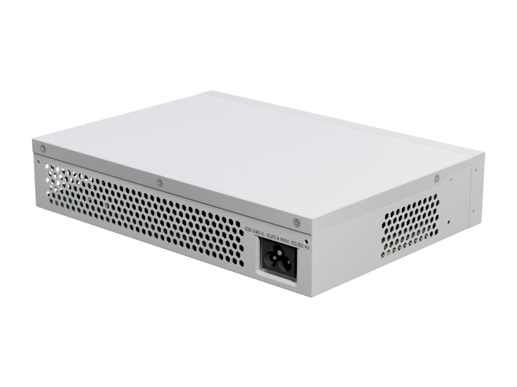 Switch možno ľahko inštalovať na stôl alebo do 10"/19" racku, prípadne 2 vedľa seba do 19" racku. Napájanie zaisťuje vstavaný zdroj na 230V AC. Operačný systém SwOS Lite umožňuje pokročilú správu s funkciami ako monitoring rozhranie, VLAN, QoS, filtrovanie MAC adries či Broadcast storm control.