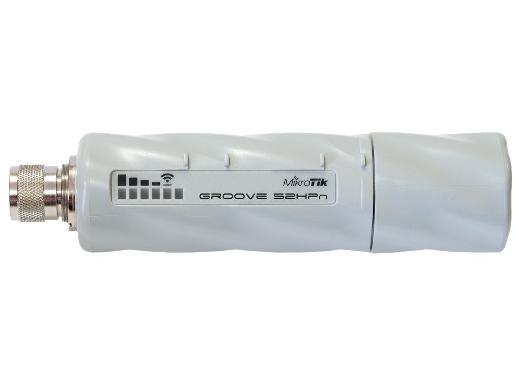 MikroTik Groove 52 2,4GHz/5GHz Backbone/CPE, konektor N-male plně vybavený bezdrátový RouterBOARD poháněný systémem RouterOS * díky technologii Nv2 TDMA je možné dosáhnout agregované propustnosti 125Mb/s * odolný vůči povětrnostním vlivům * LED indikátory pro úroveň signálu Specifikace Architektura: MIPSBE Procesor: AR9342 Počet jader CPU: 1 Frekvence CPU: 600MHz Operační systém: MikroTik RouterOS, licenční úroveň 3 Velikost paměti RAM: 64MB Velikost úložiště: 16MB Typ úložiště: BLIKAT Provozní teplota: -40°C až 70°C WLAN: Wi-Fi 4 (802.11a/b/g/n) Maximální přenosová rychlost: 150Mbit/s Ethernet: 10/100Mbit/s Provozní frekvence: 2,4GHz, 5GHz Porty: * 1x RJ-45 * 1x N-male Napájení: 1 (PoE-IN) Vstupní napětí POE: 9-30V Vstup PoE: pasivní Maximální spotřeba energie: 6W Monitor teploty PCB: ano Monitor napětí: ano Bzučák: ano Rozměry: 44x44x177mm Hmotnost: 193g Obsah balení: * RBGroove52HPn * napájecí adaptér 24V * PoE injektor * 2x stahovací páskaDodatočné parametre