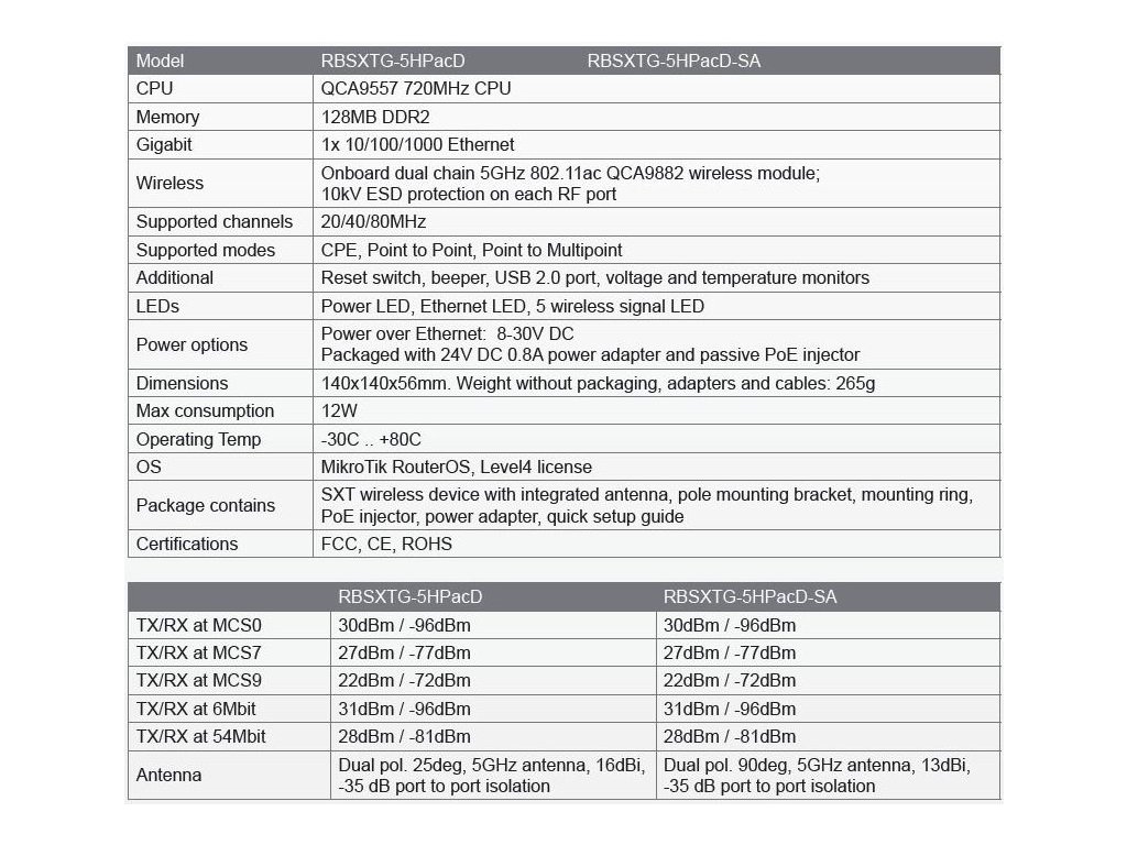 RB SXT SA ac je možné prostredníctvom PoE pripojiť aj na dlhšie vzdialenosti - podporuje normu 802.3at. RF porty poskytujú 10 kV prepäťovú ochranu. Zariadenie pracuje s novým wifi štandardom 802.11ac - modulácia 256-QAM, 80 MHz kanály a reálna prenosová rýchlosť až 540 Mbit. RB SXT ac je dodávaný s RouterOS L4 vhodnou na prístupové body, klientské riešenia alebo spoj point-to-point. RouterOS Mikrotik plne podporuje siete IPv6 a v aktuálnej verzii ponúka okrem iných aj tieto funkcie: statické prideľovanie adries a routovanie, dynamické routovanie, firewall, DNS, web proxy.