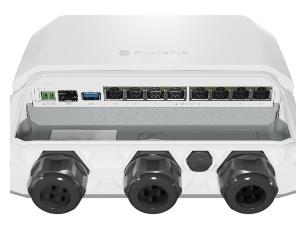 Router disponuje 7x gigabit LAN, 1x 2.5Gbit LAN s možnosťou PoE IN aj PoE OUT (802.3af/at) na všetkých ôsmich ethernetových portoch s celkovým PoE budgetom 130 W, DC jack či svorkovnicu z ľavého boku (24.. 57V DC ), 1x SFP+ slot a 1x USB 3.0.