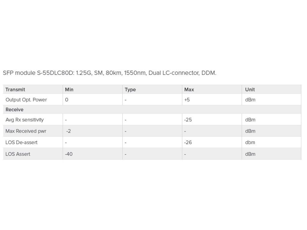 S-55DLC80D je singlemode Gigabitový SFP modul s vlnovou dĺžkou 1550nm a dvoma LC konektormi pre spojenie až na vzdialenosť 80km.