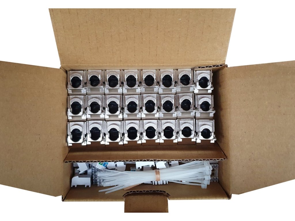 V tomto novém multipack balení jsou samořezné keystony Solarix k dispozici po 24 kusech, a to v recyklovatelném kartónovém boxu a bez plastových sáčků. Tento způsob balení je tedy mnohem šetrnější k životnímu prostředí (tj. místo v plastových obalech je 24 keystonů zabaleno v jednom recyklovatelném papírovém boxu) a rovněž toto balení umožní rychlejší dostupnost keystonů při instalaci (tj. není potřeba keystony vybalovat každý zvlášť). Samořezné keystony Solarix se vyznačují velmi jednoduchou instalací, ke které není nutné použít zařezávací nástroj. Tyto keystony bez problémů splňují parametry specifikované v mezinárodních standardech strukturované kabeláže ANSI/TIA 568, ISO/IEC 11801 a EN 50173 pro kategorii 5E a třídu vedení Class D, včetně všech nejnovějších dodatků. Keystony jsou osazeny 180° samořeznou svorkovnicí, která je označena barevným schématem podle typu zapojení, a to buď podle standardu T568A, nebo T568B. Do této svorkovnice je možné zařezat kabely typu drát s vodiči o velikosti AWG 26 – 22. Standardní barva nestíněných samořezných keystonů Solarix je černá, u stíněné verze je tělo modulu opatřeno stříbrnou kovovou částí. Díky svým kompaktním rozměrům jsou tyto samořezné keystony kompatibilní s modulárními zásuvkami většiny výrobců (např. ABB, Schneider, Legrand, Moeller, Hager, Obzor atd.). Tuto kompatibilitu si můžete ověřit v tabulce kompatibility, která se nachází v záložce "Odkazy". Technické parametry Kategorie: CAT5E Podporované protokoly: 2.5G/5GBASE-T a nižší Stínění: ano Min. životnost portu: 1 000 zapojení/odpojení Krytí kontaktů: 50 µ zlata a 100 µ niklu Svorkovnice: samozářezová Min. životnost svorkovnice: 200 zařezání Velikost a typ vodiče: AWG 26 - 22, drát Materiál nekovových částí: FR plast podle UL94-0 Barva: černá (vnitřní část), stříbrná (kovové tělo) Skladovací teplota: -40 až 70 °C Provozní teplota: -10 až 60 °C Max. provozní vlhkost: 93 % Balení: 24 ks, kartónový box Rozměry balení (výška x šířka x hloubka): 60 mm x 148 mm x 120 mm Přepravní balení: 576 ks (tj. 24 balení po 24 ks), kartónový box Rozměry přepravního balení (výška x šířka x hloubka): 270 mm x 370 mm x 320 mmDodatočné parametre