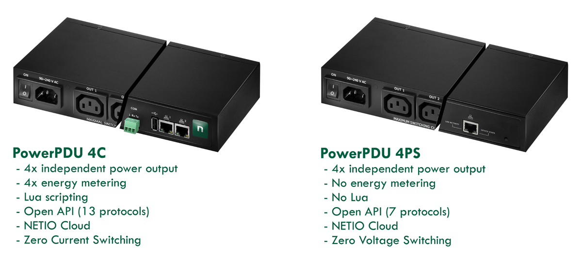 - NETIO PowerPDU 4PS nepodporuje elektrické merania. Každý výstup možno samotatně vypnúť, zapnúť alebo vyvolať reset (vypnutie na krátky čas). Pre postupné zapínanie výstupov je možné na každom výstupe definovať oneskorené zapnutie po pripojení do elektriny.