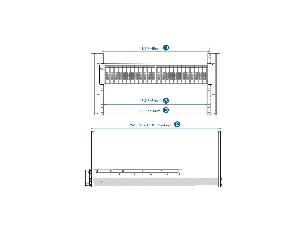 Velikost racku A. Šířka montážního sloupku: >= 17,8" (451 mm) B. Šířka panelu: >= 19,1" (485 mm) C. Hloubka montážního sloupku: 24" ~ 36" / 609.6 ~ 914.4 mm D. Vzdálenost mezi dvěma rackovými sloupky (měření čtvercových otvorů racku střed-střed) je 18,3"(465 mm)Kompatibilní se serverovými stojany se čtvercovými otvory 9,5 mm x 9,5 mm nebo s kulatými otvory o průměru 7,1 mm.