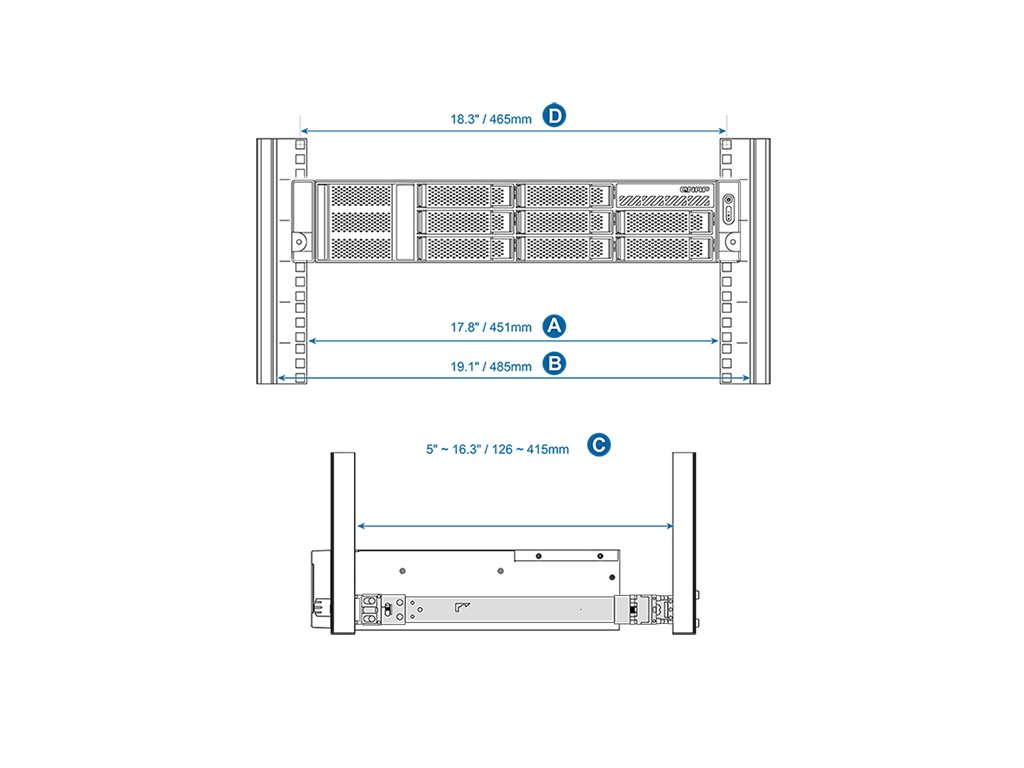 Velikost racku A. Šířka montážního sloupku: >= 17,8" / 451 mm B. Šířka panelu: >= 19,1" / 485 mm C. Hloubka montážního sloupku: 5" – 16,3" / 126 – 415 mm D. Vzdálenost mezi dvěma regálovými sloupky (měření čtvercových otvorů regálu střed-střed) je 18,3" / 465 mmKompatibilní se serverovými stojany se čtvercovými otvory 9,5 mm x 9,5 mm nebo s kulatými otvory o průměru 7,1 mm.