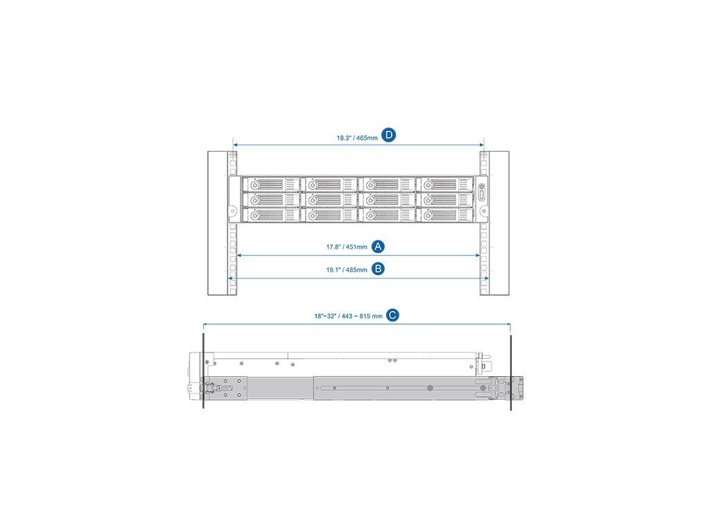 D. Vzdálenost mezi dvěma rackovými sloupky (měření čtvercových otvorů racku střed-střed) je 18,3"(465 mm)