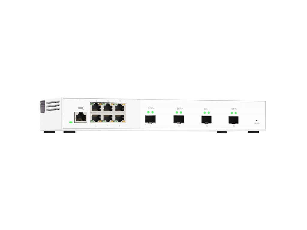 Zařízení QSW-M2106-4S je webově řízený přepínač (switch) úrovně 2 se čtyřmi porty 10GbE SFP+ a šesti porty 2,5 Gigabit. Zařízení QSW-M2106-4S podporuje přepínání a správu sítě úrovně 2 (L2) prostřednictvím uživatelsky vstřícného webového rozhraní, nabízí flexibilní nasazení v hybridních vysokorychlostních síťových prostředích a poskytuje řešení pro správu sítě na základní úrovni, které zvládnou používat I ti, kdo nepatří mezi profesionály v oboru IT. Díky vysokému výkonu, uživatelsky přívětivé správě a stolnímu provedení umožňuje zařízení QSW-M2106-4S nákladově efektivní upgrade na síť 2,5GbE nebo 10GbE při optimalizaci šířky pásma a zajištění bezpečné údržby sítě.