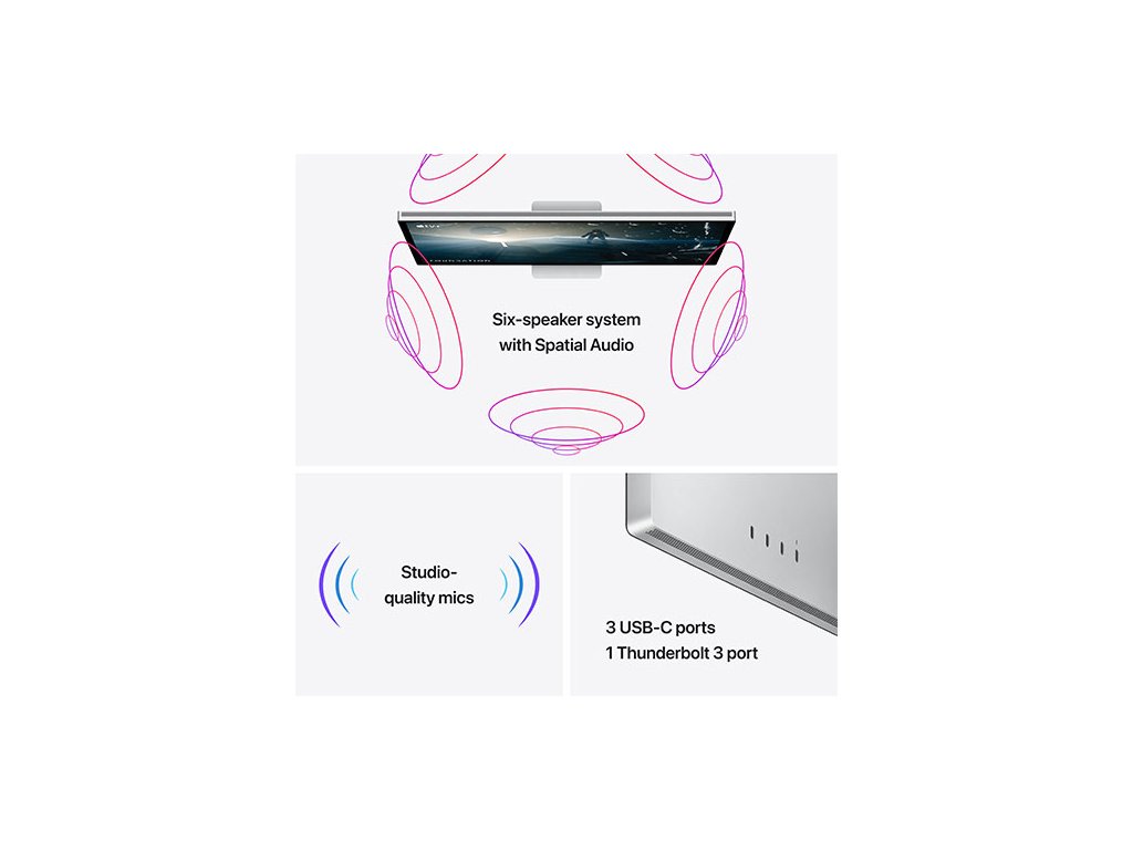 27palcový Retina 5K displej. 12MP ultraširokoúhlá kamera s centrováním záběru. Tři mikrofony a šest reproduktorů s prostorovým zvukem. Studio Display tě jako velké nádherné okno od prvního okamžiku vtáhne do nových světů. Je tenký a má obrazovku přes celou plochu. A je nabitý fenomenálními funkcemi, takže na něm všechno ožívá v nádherných barvách a působivých detailech. Sklo s nanotexturou - Stojan s nastavitelným náklonem a výškouSklo s nanotexturou omezuje odlesky ještě víc a přitom zachovává výjimečnou kvalitu obrazu na místech s ostrým světlem, třeba v prosluněných prostorách. Typ obrazovky: Retina 5K displej Podsvícení: LED LCD Úhlopříčka [palce]: 27palcový (úhlopříčně) Rozlišení: 5120 × 2880 při 218 pixelech na palec Poměr stran: 16:9 Jas [cd/m2]: 600 nitů Počet barev: Podpora 1 miliardy barev Zvuk: *Hi-fi soustava šesti reproduktorů s woofery v antirezonančním uspořádání *Široký stereo zvuk *Podpora prostorového zvuku při přehrávání hudby nebo videa ve formátu Dolby Atmos *Soustava tří mikrofonů studiové kvality s vysokým odstupem signálu od šumu a směrovým formováním paprsku Kamera: 12MP ultraširokoúhlá kamera se 122° zorným polem, Clona f/2,4, Centrování záběru Konektory: *Jeden port Thunderbolt 3 (USB-C), tři porty USB-C Napájení: 100 až 240 V (stř.) Spotřeba [W]: 21,2 Stand By režim [W]: 0,5 Třída energetické náročnosti: E Montáž na zeď: Ne Naklápění monitoru: Stojan s nastavitelným náklonem a výškou Náklon: –5° až +25° Úprava výšky: celkem 105 mm Barva: stříbrná Rozměry: *Výška (v dolní poloze): 47,9 cm *Výška (v horní poloze): 58,3 cm *Šířka: 62,3 cm *Hloubka: 20,7 cm Hmotnost [kg]: 7,7 kg Obsah balení: *Studio Display se sklem s nanotexturou a stojanem s nastavitelným náklonem a výškou *Thunderbolt kabel (1m) * Čisticí hadřík na sklo s nanotexturou Záruka: 12 měs.