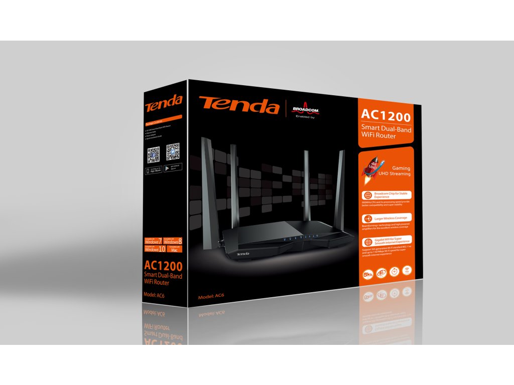 AC Dual-Band Wi-Fi router 802.11 ac/a/b/g/n, až 1200 Mb/s, VPN server/klient, SMART aplikace, 1x WAN, 3x LAN, 4x anténa 5 dBi. (2,4GHz 300Mbps + 5GHz 900Mbps), WISP, Universal Repeater Součástí balení je český, slovenský a polský manuál. Popis produktu Dvoupásmový bezdrátový WiFi router pracující souběžně v pásmu 2,4GHz (300 Mb/s) a 5GHz (900Mb/s), celková rychlost WiFi až 1200 Mb/s, standardy WiFi 802.11ac/a/b/g/n, 1x WAN, 3x LAN, WPS, QoS, zabezpečení WPA/WPA2-PSK, 4x anténa 5 dBi. Podporuje také VPN Server/klient a ovládání pomocí SMART aplikace. Tento router je ideálním řešením pro hraní Online her a streamování HD videí. V kombinaci pásma 2,4GHz (rychlost 300 Mb/s) s pásmem 5GHz (900 Mb/s) se docílí celkové rychlosti na WiFi až 1200 Mb/s. V kombinaci s velkým výběrem zabezpečení je ideálním WiFi routerem pro vaši práci i zábavu. Maximální výkon a rychlost Díky podpoře veškerých dostupných standardů WiFi 802.11 ac/a/b/g/n je tento router univerzálním řešením vaší bezdrátové sítě. Obsahuje chipset od známého výrobce z USA, Broadcom. Tento chipset je nastaven v AC6 tím způsobem, aby 4 externí všesměrové antény tvořily co největší pokrytí bezdrátové sítě, zároveň při nejvyšší rychlosti dle dané normy. To vše s inteligentním řízením chipsetu, spotřeby, a kvality služeb tvoří opravdový ideál i pro náročnější uživatele. Podpora 2,4GHz a současně 5GHz Výhod využití obou pásem je hned několik. Ideální způsob rozdělení: - 2,4GHz: prohlížení webových stránek, stahování souborů, emaily apod. - 5GHz: hraní Online her, HD streamování videa, zvláště aplikace kde je důležitá latence. Pásmo 2,4GHz také bývá ve větších zástavbách nebo panelových domech velmi zarušené, a dochází tak k degradaci výkonu na nižší úroveň, tak se WiFi routery z okolí ruší navzájem. Při použití 5GHz vám tato starost zcela odpadá. Pokrytí signálem je zajištěno pomocí čtyř 5 dBi antén. Je možné také využít režim zopakování signálu v režimu WISP nebo Universal Repeater. Také je možné nastavení síly signálu pro každou frekvenci zvlášť (Low, Standart, High). IPTV a QoS Služba, která prochází velkým vývojem a stává se čím dál oblíbenější v ČR i SR je právě IPTV. Jedná se o televizní vysílání šířené po Internetu. Tenda AC6 obsahuje nastavení kterým tuto službu povýšíte na vyšší úroveň a bude brána v domácí síti jako hlavní. Samozřejmostí je také pokročilé QoS, díky kterému jsou upřednostněny v síti služby, které jsou náročné na zpoždění a latenci. SMART Aplikace TendaCloud Aplikace pro Smart mobilní telefony TendaCloud, díky které můžete ovládat některé funkce routeru, provádět měření a povolit např. WiFi pro návštěvu. Také nastavení WiFi, test signálu, nastavení síly signálu, a přístupová pravidla pro různá zařízení. WiFi pro návštěvu (Guest Network) Je možné nastavení sítě pro návštěvu Guest Network a to pro WiFi 2,4 GHz a také pro 5 GHz. SMART Power & LED Je možné přesně nastavit v jakou dobu bude router vypnutý (pouze v pohotovostním režimu) a kdy se automaticky zapne. Také je možné nastavit LED diody na zařízení, buď nechat zapnuté nebo vypnuté nebo nastavit časovač. VPN Server / Virtual Server Tenda AC6 také vyniká plnou funkcí VPN Server. Podporuje PPTP Server a PPTP/L2TP Client, obojí včetně kompletního nastavení. Také funkce Virtual Server díky které je možné nastavení veškerých portů. Zabezpečení a DDNS Zařízení AC6 podporuje velké možnosti zabezpečení. Nejnovější WPA, WPA2, mixedWPA/WPA2 vždy s PSK a šifrováním TKIP nebo AES. Tato nabídka je navíc doplněna a WPS. Systém WPS umožňuje připojení pomocí stisknutí tlačítka na routeru a na klientské stanici, router tak automaticky nastaví spojení zabezpečené pomocí WPA2-PSK a není nutné znát heslo do WiFi sítě. Tento způsob je nejen rychlý a jednoduchý, ale také bezpečný. Router také má možnost nastavení DDNS a to pro no-ip.com, 3322.org, dyndns.org. Technické parametry Wi-Fi standardy: 802.11ac/a/b/g/n Frekvence: 2,4 GHz, 5 GHz Bezdrátové režimy: Wireless Router, AP, Router, WISP, Universal Repeater Přenosová rychlost: 1200 Mb/s (2, 4GHz 300Mb/s + 5GHz 900Mb/s) Modulace: DSSS, OFDM Šířka kanálu: 20 MHz, 40 MHz, 80 MHz Výstupní výkon: < 20 dBm (EIRP) Regulace výstupního výkonu: ano Citlivost: 2, 4GHz: 11g 54M_-77dBm, 11n HT20_-74dBm, 11n HT40_-72dBm / 5GHz: 11a 6Mbps_-96dBm, 11a 54Mbps_-79dBm, 11ac HT20_-71dBm, 11ac HT40_-66dBm, 11ac HT80_-63dBm Zabezpečení: MAC ACL, URL filtering, WPA-PSK, WPA2-PSK, Mixed WPA/WPA2-PSK Způsob ovládání: HTTP, Remote web management, SMART aplikace do mob. telefonu Síťové funkce: UPnP, Virtual server, DMZ host, DHCP server/client, WDS, WPS, IPTV, VPN Server/Klient QoS: 802.11e WMM, IPTV Rozhraní: 1x tlačítko WiFi On/Off, 1x tlačítko WPS/Reset, 1x WAN, 3x LAN LED diody: 1x System, 1x WAN, 1x LAN, 1x 2.4GHz, 1x 5GHz, 1x WPS Anténa: 4x 5 dBi, neodnímatelné Chipset: Broadcom Provedení: indoor, desktop Materiál obalu: plast Napájení: 12 V DC 1A Chlazení: pasivní Montáž na zeď: ano Provozní teplota: 0° až 40 °C Rozměry (v x š x h): 220 x 142 x 49 mm Rozměry krabice (v x š x h): 309 x 295 x 77 mm Hmotnost: 0,8 kg Obsah balení 1x Tenda AC6 1x Stručná instalační příručka (CZ, SK, PL, EN) 1x Napájecí adaptér (12V DC, 1 A) 1x Datový kabel RJ45 Více informací na www.tenda.czDodatočné parametre