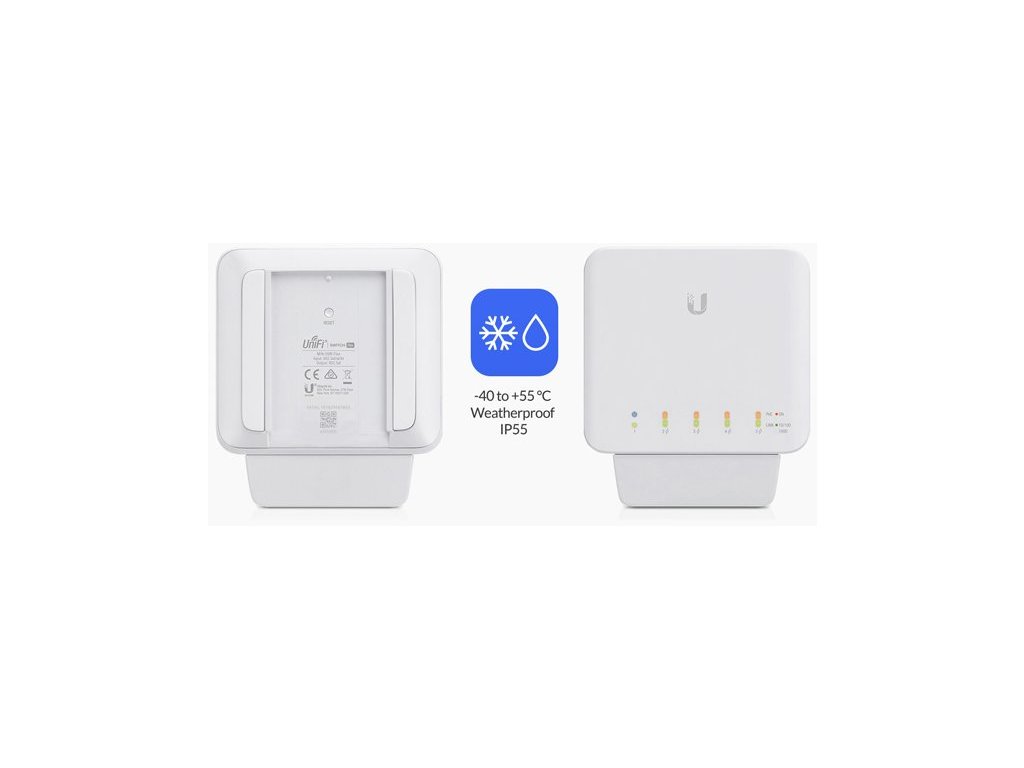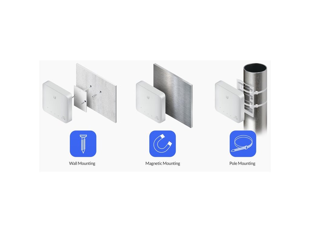 USW-FLEX je 5-portový vonkajšií gigabitový switch s možnosťou PoE-In a PoE-Out na 4 portoch. Switch umožňuje na výstupných portoch aktívne napájanie typu 802.3af, čo dáva celkovo 15.4W na každom porte. USW-FLEX možno inštalovať vodorovne alebo zvislo, takže je ideálny pre inštalácie na rovnú plochu, magnetickú montáž, na stenu, alebo na stĺp.