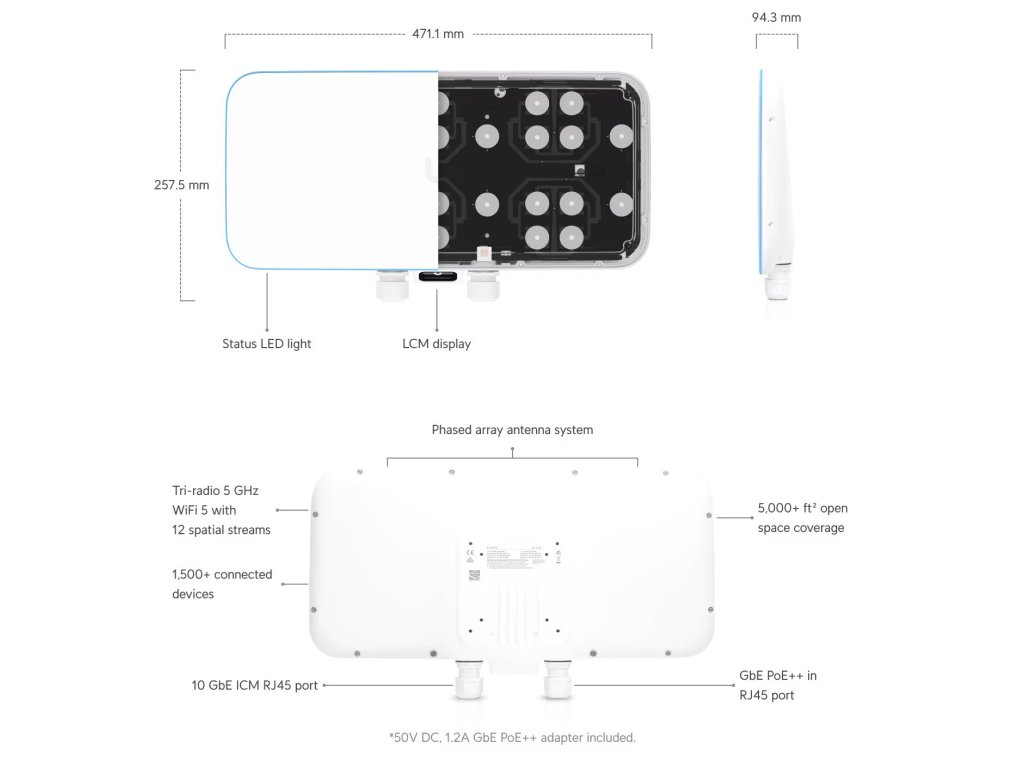 Jednotka disponuje iba 5GHz rádiovú časťou, ktorá poskytuje vyšší výkon a priepustnosť ako pásmo 2.4Ghz. Dual-Mode nastaviteľná anténa má zisk 10dBi pri vyžarovacím uhle 90 ° a 15dBi pri vyžarovacím uhle 50 °. Vďaka 3 rádiovým častiam dokáže jednotka obslúžiť až 1500 pripojených zariadení, odporúčané maximum je 750 klientskych zariadení. Maximálna modulačné rýchlosť vďaka technológii 4x4 MU-MIMO činí 1733 Mbps pre každú rádiovú časť a nechýba ani podpora technológie Beamforming. Prenos dát po ethernetu zaistí dvojica portov (1x 10/100 / 1000Mbps, 1x 1 / 10Gbps IMC). Napájanie jednotky je možné aktívnym POE 802.3bt alebo priloženým POE adaptérom 50V / 1,2A s gigabitovým portom. BaseStation XG je možné namontovať na stožiar alebo stenu pomocou priložených držiakov. Novinkou je možniost montáže na štandardizované držiaky VESA, pripravené sú otvory pre rozteče 75mm a 100mm.