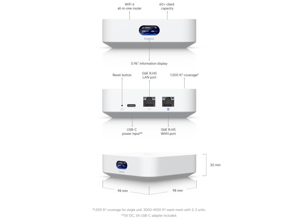 UniFi Express je výkonná a kompaktná UniFi Cloud Gateway s WiFi 6 access pointom. K dispozícii je 1x WAN port a 1x LAN port na rozšírenie siete. Router je vybavený LCM displejom na zobrazenie rôznych informácií, napríklad rýchlosti sťahovania a nahrávania.