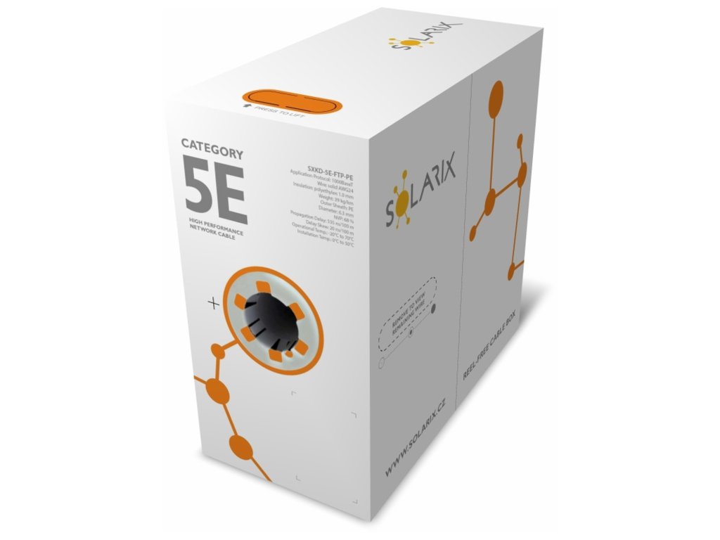 Instalační kabel Solarix s označením SXKD-5E-FTP-PE je spolehlivý venkovní stíněný kabel kategorie 5E, který je určený pro provoz ethernetových protokolů, včetně 2.5GBASE-T a 5GBASE-T*. Konstrukce kabelu je F/UTP, typ pláště UV stabilní PE s třídou reakce na oheň Fca a stupněm krytí IP67. Vodiče kabelu jsou vyrobeny z kvalitního měděného drátu s čistotou mědi 99,97 %. Kabel bez problémů splňuje požadavky z mezinárodních standardů ISO/IEC 11801, EN 50173 a ANSI/TIA 568.2-D. Stejně jako ostatní kabely Solarix, je i kabel SXKD-5E-FTP-PE značen metráží po 1 m v rozsahu od 0 do 305 m. Kabel je dodáván ve vysoce odolném třívrstvém leštěném kartónovém boxu (vždy barevně odlišeném podle typu kabelu), na kterém jsou uvedeny všechny nezbytné produktové informace, včetně čárových kódů, výrobní šarže, popisu a nejdůležitějších technických parametrů. Tento kabel není určen pro trvalé uložení do vody ani do země bez odpovídající řádné ochrany. Technické parametry Kategorie: CAT5E Podporované protokoly: 2.5/5GBASE-T a nižší Stínění: fólie kolem všech 4 párů Šířka pásma: 100 MHz Typ a velikost vodiče: měděný drát 0,50 mm ± 0,005 mm Izolace a průměr vodiče s izolací: HDPE 1,0 mm Třída reakce na oheň; typ pláště: Fca; PE Barva pláště: černá RAL 9005 Průměr kabelu: 6,2 mm Váha: 34,8 kg/km NVP: 68 % Propagation delay: 535 ns/100 m Delay skew: nižší než 45 ns/100 m Skladovací teplota: -20 °C až 70 °C Provozní teplota: -20 °C až 70 °C Teplota při instalaci: 0 °C až 50 °C Balení: 305 m, třívrstvý kartónový box Rozměry balení (výška x hloubka x šířka): 420 mm x 420 mm x 215 mm Počet balení na paletě: 30 boxů (velká paleta), 24 boxů (malá paleta)Dodatočné parametre