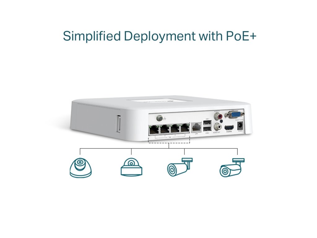 Záznamové zariadenie od značky TP-Link pre nahrávanie a napájanie až 4 IP kamier. Dokáže nahrávať kamerové záznamy v maximálnom rozlíšení až 8 MP.