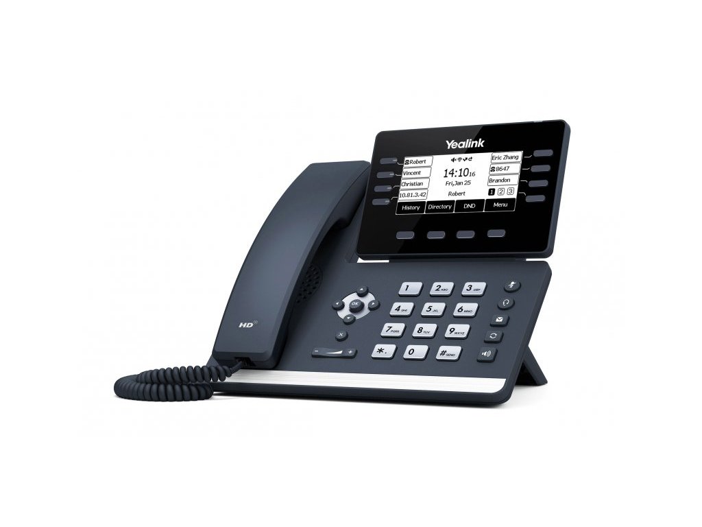 Telefon určený pro méně náročné manažery, kteří však požadují kvalitu, jednoduchou a rychlou obsluhu svého IP telefonu. 3,7" černobílý polohovatelný displej Vestavěné Bluetooth, Wi-Fi Duální gigabitový ethernetový port Technologie HD Voice s Yealink Acoustic Shield UBS port pro nahrávání hovorů Yealink T53W je určen pro všechny uživatele, kteří denně potřebují komunikovat s týmem, obchodními partnery či zákazníky. Telefon poskytuje pokročilé funkce pro telefonování, HD přenos zvuku a velkou flexibilitu. Telefony dávají podnikům všech velikostí velmi kvalitní, do budoucna trvalé a jedinečné řešení, které zvyšuje efektivitu komunikace a spolupráce za velice příznivou cenu. Telefon disponuje elegantním designem, velkým displejem s podsvícením a vysokým rozlišením. Plně nastavitelný displej poté splňuje potřeby sledování obrazovky v různých úhlech nebo za různých světelných podmínek. Skvělá kvalita zvuku je zajištěna díky technologii Yealink Acoustic Shield, která využívá více mikrofonů k vytvoření virtuálního "štítu" mezi reproduktorem a vnějším zdrojem zvuku. Při zapnutí této funkce dochází k blokování či ztlumení zvuků zvenčí, takže je vás na druhé straně zřetelně a dobře slyšet. Je tedy ideálním kandidátem do rušných a hlučných pracovních prostor, jako jsou call centra a kancelářské prostory. Zajímavým bonusem tohoto telefonu je možnost okamžitého sdílení obsahu s druhou stranou. Tato funkcionalita umožňuje rychlou diskuzi a urychluje rozhodování. Telefon podporuje kompatibilitu DECTových bezdrátových telefonů prostřednictvím donglu Yealink DD10K. Můžete si tak bezproblémově přepínat hovory mezi stolním telefonem a bezdrátovým telefonem na DECTové bázi. V zařízení také najdete vestavěný Bluetooth, Wi-Fi a USB 2.0 pro nahrávání hovorů nebo připojení bezdrátového USB headsetu. K telefonu také můžete připojit expanzní modul Yealink EXP50. USB rozhraní 2.0 Datová rozhraní Ethernet, WiFi, Bluetooth, USB Síťové služby Fixed IP, DHCP, PPPoE NAT Ano QoS 802.1p/q, DSCP Displej - typ Černobílý Displej - velikost 3,7 VoIP standardy SIP Počet SIP účtů 12 Hlasité telefonování (Hands-Free) Ano Vzdálené tel. seznamy XML, LDAP Volací funkce Přesměrování, Přidržení, přepojení Management web, telefon Diagnostika trace, syslog Příručky Český krátký návod Nastavení hlasitosti vyzvánění i hovoru Ano Zobrazení data a času Ano Čekající hovor (CW) AnoDodatočné parametre